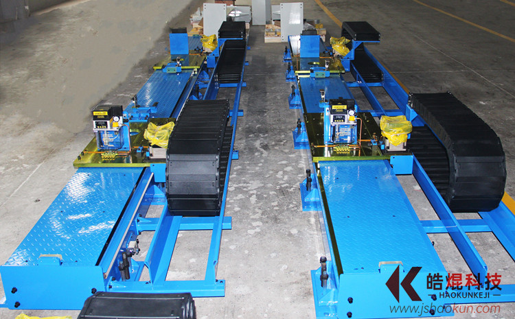 (3)、將行走單元移動至導軌的中間位置,先將行走單元兩側的八個墊板上的頂起螺栓頂住墊塊,但不繼續加力,將兩個水平儀置于行走單元的平面上,一個縱向、一個橫向,觀察縱向和橫向的水平情況,選擇四個方向中*高點為基準,從*低點開始調平,再利用其它幾點微調,具體方法就是利用頂起螺栓頂起低點,至每米水平誤差0.2mm之內,中間位置調平后,移動行走單元,至幾個不同的位置,依次進行調平,直至各位置水平符合要求,然后擰緊拉緊螺栓,用鎖緊螺母鎖緊頂起螺栓;